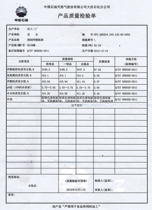 本標準適用于丙酮與氫氰酸反應(yīng)制得的精制丙酮氰醇。